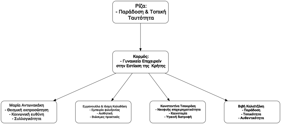 Το «Δέντρο της Βιώσιμης Εστίασης» στην Κρήτη που ακολουθεί, όπως αναδείχθηκε μέσα από τις παρεμβάσεις τους, δείχνει πως το γυναικείο επιχειρείν στον χώρο της εστίασης δεν είναι απλώς ένας παραγωγικός κλάδος, αλλά μια ολιστική στρατηγική βιώσιμης ανάπτυξης. Οι τέσσερις αυτοί άξονες – θεσμική εκπροσώπηση, εμπειρία φιλοξενίας, νεοφυής καινοτομία και τοπική παράδοση – λειτουργούν σαν κλαδιά ενός δέντρου που αντλεί δύναμη από τις ρίζες της κρητικής ταυτότητας και στηρίζει τον κορμό του γυναικείου επιχειρείν σύμφωνα με το σχεδιάγραμμα 1.