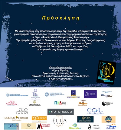 Φιλοξενία & Βιωματικός Τουρισμός [χρόνος ανάγνωσης 36 δευτερόλεπτα] Με ιδιαίτερη τιμή, σας προσκαλούμε στην 5η Ημερίδα «Κρητών Φιλοξενείν», μια κορυφαία συνάντηση του τουριστικού και επιχειρηματικού κόσμου της Κρήτης. Η φετινή διοργάνωση, με επίκεντρο το κεντρικό θέμα «Φιλοξενία & Βιωματικός Τουρισμός», θα…