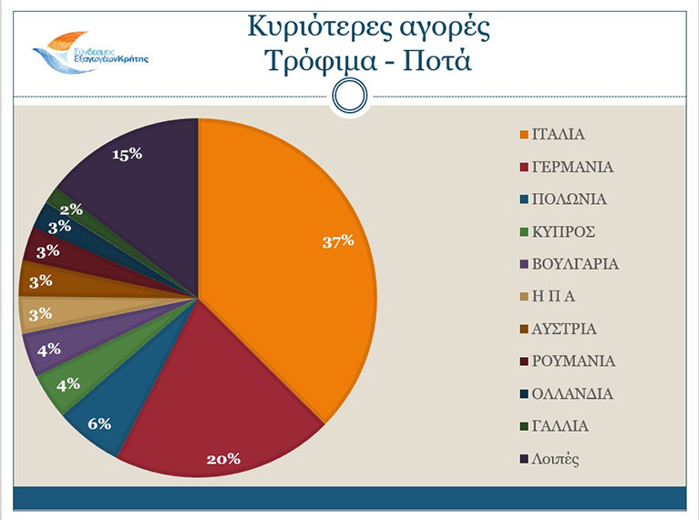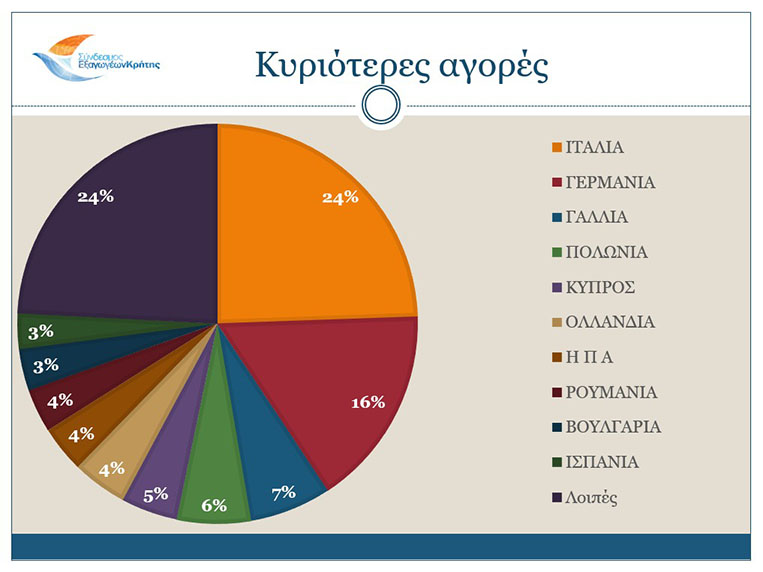 Οι βασικές αγορές παραμένουν η Ιταλία, η Γερμανία και η Γαλλία, με το ελαιόλαδο να διατηρεί τον πρωταγωνιστικό του ρόλο. Παράλληλα, οι νομοί Ηρακλείου, Λασιθίου και Ρεθύμνης ενισχύουν την εικόνα, ενώ μόνο τα Χανιά παρουσιάζουν πτώση.