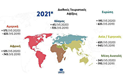 Ειδικότερα παγκοσμίως, οι διεθνείς αφίξεις τουριστών αυξήθηκαν κατά +4% το 2021 σε σχέση με το 2020, ωστόσο παρέμειναν -72% κάτω από τα επίπεδα του 2019.
