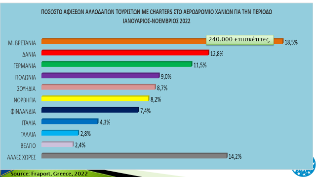 Παρατηρείται λοιπόν ότι αλλάζει το μίγμα των εθνικοτήτων, αφού σχεδόν τέσσερις στους δέκα αλλοδαπούς επισκέπτες είναι Σκανδιναβοί. Την πρώτη θέση επί των συνολικών αφίξεων, καταλαμβάνουν οι Βρετανοί με 19% και ακολουθούν οι Δανοί με 13%, Γερμανοί με 12%, ενώ οι Σουηδοί και Νορβηγοί, εκεί που βρίσκονταν στις πρώτες θέσεις επί των συνολικών αφίξεων μέχρι το 2019, οπισθοχώρησαν στην πέμπτη και έκτη θέση αντίστοιχα, κατέχοντας ποσοστό κοντά στο 9%, ποσοστό ίδιο με αυτό των Πολωνών και ακολουθούν οι Φιλανδοί με 7%. Οι Πολωνοί, των οποίων η παρουσία τους άρχισε να γίνεται αισθητή από το 2017, σήμερα αποτελούν ένα υπολογίσιμο τμήμα των επισκεπτών. Οι Ιταλοί καταλαμβάνουν ένα ποσοστό στο 4%, ενώ Γάλλοι και Βέλγοι βρίσκονται κοντά στο 3% επί των συνολικών αφίξεων στο αεροδρόμιο Χανίων.