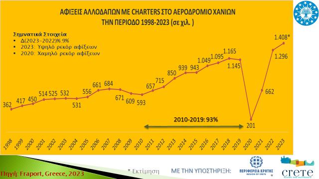 Σχετικά με τις αφίξεις αλλοδαπών τουριστών στο αεροδρόμιο Χανίων και με βάση τα πρόσφατα στοιχεία της Fraport-Greece για την περίοδο Ιανουάριος-Νοέμβριος 2023, καταγράφεται ρεκόρ αφίξεων ξεπερνώντας τα 1.4 εκ. αφίξεις και σημειώνοντας αύξηση 9% σε σχέση με την προηγούμενη περίοδο, όπου είχαν σημειωθεί 1.3 εκ. αφίξεις.