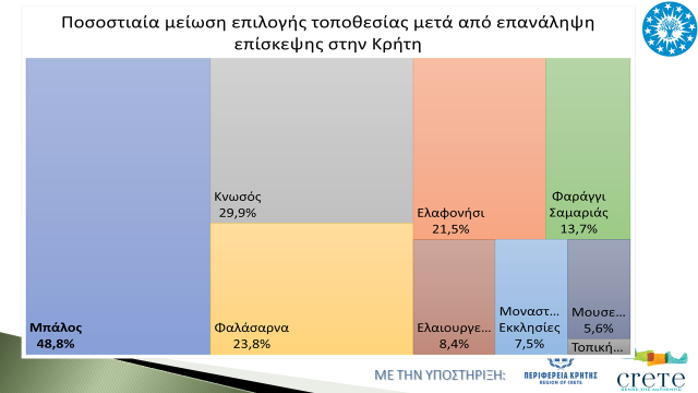 • Οι μισοί τουρίστες που έχουν ξαναεπισκεφθεί την περιοχή δεν επισκέπτονται την παραλία του Μπάλου, ενώ δύο στους πέντε δεν επισκέπτονται τις παραλίες Φαλασάρνων και Ελαφονησίου κυρίως λόγω του αρνητικού αντίκτυπου του υπερτουρισμού.