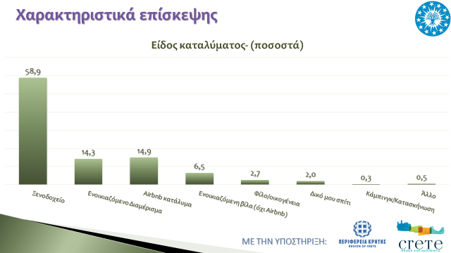 Σταθερό παραμένει το ποσοστό των αλλοδαπών τουριστών που προτιμούν τις βραχυπρόθεσμες ενοικιάσεις τύπου Air BnB, αφού περίπου ένα 15% των επισκεπτών επιλέγει να διαμένει σε τέτοια καταλύματα. Τα ξενοδοχεία, παραμένουν στην πρώτη θέση των προτιμήσεων των τουριστών, με σχεδόν έξι στους δέκα τουρίστες να τα επιλέγουν, ενώ περίπου δύο στους τρεις τουρίστες προτιμούν πολυτελή ξενοδοχεία 4 & 5 αστέρων. Το ποσοστό αυτών που επιλέγουν ενοικιαζόμενα διαμερίσματα/δωμάτια παραμένει κοντά στο 15%.
