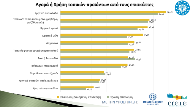 Σχετικά με τα τοπικά αγροτικά προϊόντα, ο αλλοδαπός τουρίστας μένει πολύ ικανοποιημένος από τα τοπικά χαρακτηριστικά των προϊόντων αυτών, ενώ προβαίνει και σε αγορά αυτών με το ελαιόλαδο, τα τοπικά τυριά, το κρασί, το μέλι, τα λαχανικά, τον φυσικό χυμό πορτοκαλιού, την τσικουδιά και τα βότανα/μπαχαρικά να συνεχίζουν και φέτος να προτιμώνται περισσότερο από τους αλλοδαπούς τουρίστες, ενώ ιδιαίτερη δυναμική παρουσιάζουν φέτος τα τοπικά τυριά. Μάλιστα, ένα αξιοσημείωτο στοιχείο είναι ότι η πλειοψηφία των τουριστών που έχουν ήδη ξαναεπισκεφθεί τη Δυτική Κρήτη αγοράζουν περισσότερο τα τοπικά αγροτικά προϊόντα από ότι οι τουρίστες που επισκέπτονται την περιοχή για πρώτη φορά, γεγονός που αναδεικνύει την εμπιστοσύνη που δείχνουν οι επισκέπτες στα Κρητικά ποιοτικά αγροτικά προϊόντα.