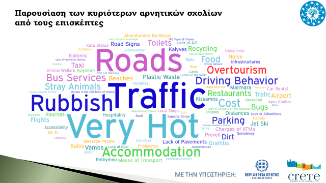 Οι αλλοδαποί τουρίστες συνεχίζουν να εκφράζουν τη δυσαρέσκεια τους σχετικά με την κακή κατάσταση του οδικού δικτύου και της σήμανσης. Επίσης, λόγω του μεγαλύτερου τουριστικού κύματος που έχει δεχτεί ποτέ η περιοχή, εκφράζεται έντονα η δυσαρέσκεια και ο προβληματισμός για την κυκλοφοριακή συμφόρηση και την έλλειψη διαθέσιμων χώρων στάθμευσης κυρίως στην Πόλη Χανίων, την ανεπαρκή υποδομή για ποδηλατοδρόμους, ενώ το σύστημα αποκομιδής και περισυλλογής απορριμμάτων χρήζει περαιτέρω αναβάθμισης, καθώς πραγματοποιείται και έντονη χρήση πλαστικών κυρίως στην Πόλη των Χανίων.