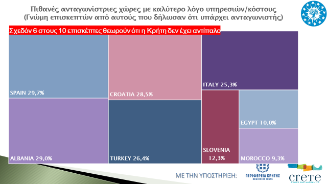 Υψηλό βαθμό παίρνει η Κρήτη συγκριτικά με ανταγωνιστικούς προορισμούς σε σχέση με το λόγο υπηρεσιών/κόστους, αφού έξι στους δέκα τουρίστες δηλώνουν ότι η Κρήτη αποτελεί ο καλύτερος προορισμός και δεν συγκρίνεται με άλλον. Από τους υπόλοιπους τουρίστες, ένας στους τρεις θεωρεί την Ισπανία, την Αλβανία και την Κροατία προορισμούς με καλύτερο λόγο υπηρεσιών/κόστους και ένας στους τέσσερις την Τουρκία και την Ιταλία. Αναφορικά με άλλους προορισμούς, σχεδόν ένας στους δέκα δηλώνει τη Σλοβενία, την Αίγυπτο και το Μαρόκο ως ανταγωνίστριες χώρες σχετικά με το λόγο υπηρεσιών/κόστους.