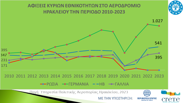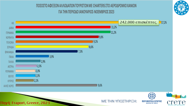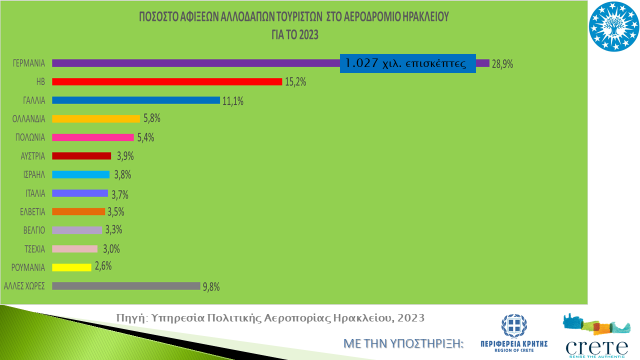 • Το 37% των αλλοδαπών τουριστών στο αεροδρόμιο Χανίων προέρχονται από Σκανδιναβικές χώρες, ενώ το 55% των αλλοδαπών τουριστών στο αεροδρόμιο Ηρακλείου προέρχονται από Γερμανία, Βρετανία, Γαλλία.