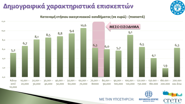 Ο μέσος όρος του εισοδηματικού τους επιπέδου παραμένει πολύ υψηλός στα 80.000 ευρώ, κυρίως λόγω της αύξησης των αλλοδαπών τουριστών που προέρχονται από χώρες της Αμερικής, Καναδά και Αυστραλίας, οι οποίοι είναι και πολύ υψηλού εισοδηματικού προφίλ. Αξιοσημείωτο είναι το γεγονός ότι σχεδόν το 1/3 των επισκεπτών στην περιοχή μας δηλώνει εισόδημα πάνω από 100.000 €.