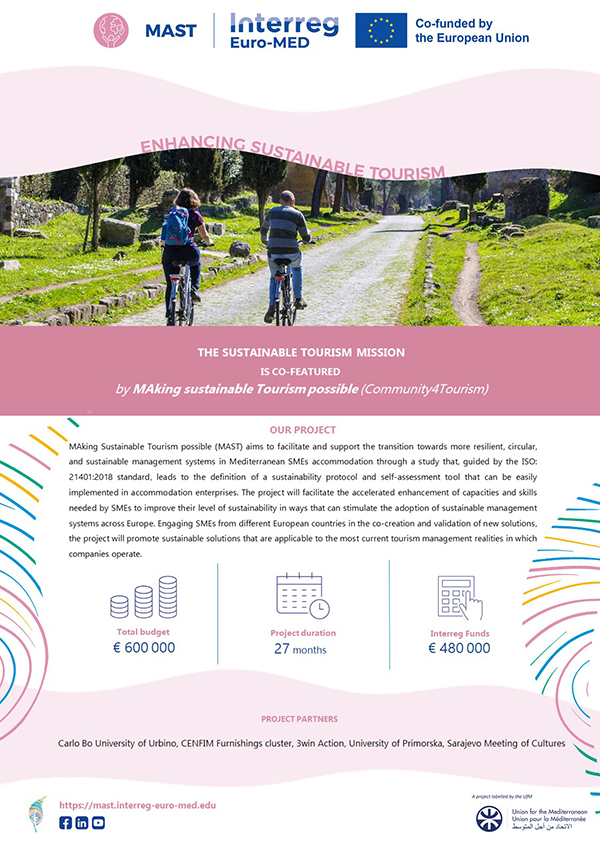 Το «MAST – MAking Sustainable Tourism possible» συγκροτείται από 5 εταίρους, το Ιταλικό Πανεπιστήμιο του Ουρμπίνο «Carlo Bo», την Ένωση Επιχειρήσεων CENFIM από την Ισπανία, το Πανεπιστήμιο της Πριμόρσκα της Σλοβενίας, την ΜΚΟ «Sarajevo Meeting of Cultures» από τη Βοσνία Ερζεγοβίνη και την «3win Action» από την Ελλάδα.