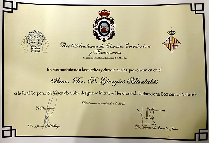 Μια σημαντική διεθνής διάκριση για την Ελλάδα και ειδικότερα για την Κρήτη αποτελεί η ανάδειξη του Αναπληρωτή Καθηγητή του Πολυτεχνείου Κρήτης, Γιώργου Ατσαλάκη, ως Επίτιμου Μέλους του Barcelona Economics Network της Βασιλικής Ακαδημίας Οικονομικών και Χρηματοοικονομικών Επιστημών της Ισπανίας (Real Academia de Ciencias Económicas y Financieras). Η τιμητική αναγνώριση απονεμήθηκε στις 21 Νοεμβρίου 2025, στο πλαίσιο του 20ού Διεθνούς Συνεδρίου της Ακαδημίας στη Βαρκελώνη.