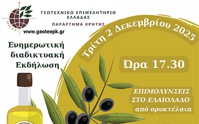 [χρόνος ανάγνωσης 29 δευτερόλεπτα] Το Γεωτεχνικό Επιμελητήριο Ελλάδας Παράρτημα Κρήτης οργανώνει Ενημερωτική Διαδικτυακή Εκδήλωση με θέμα «Επιμολύνσεις στο Ελαιόλαδο από ορυκτέλαια μέσω λανθασμένων πρακτικών» την Τρίτη 2 Δεκεμβρίου 2025, ώρα 17:30.Η εκδήλωση απευθύνεται σε όλους όσους ασχολούνται με την ελαιοπαραγωγή…
